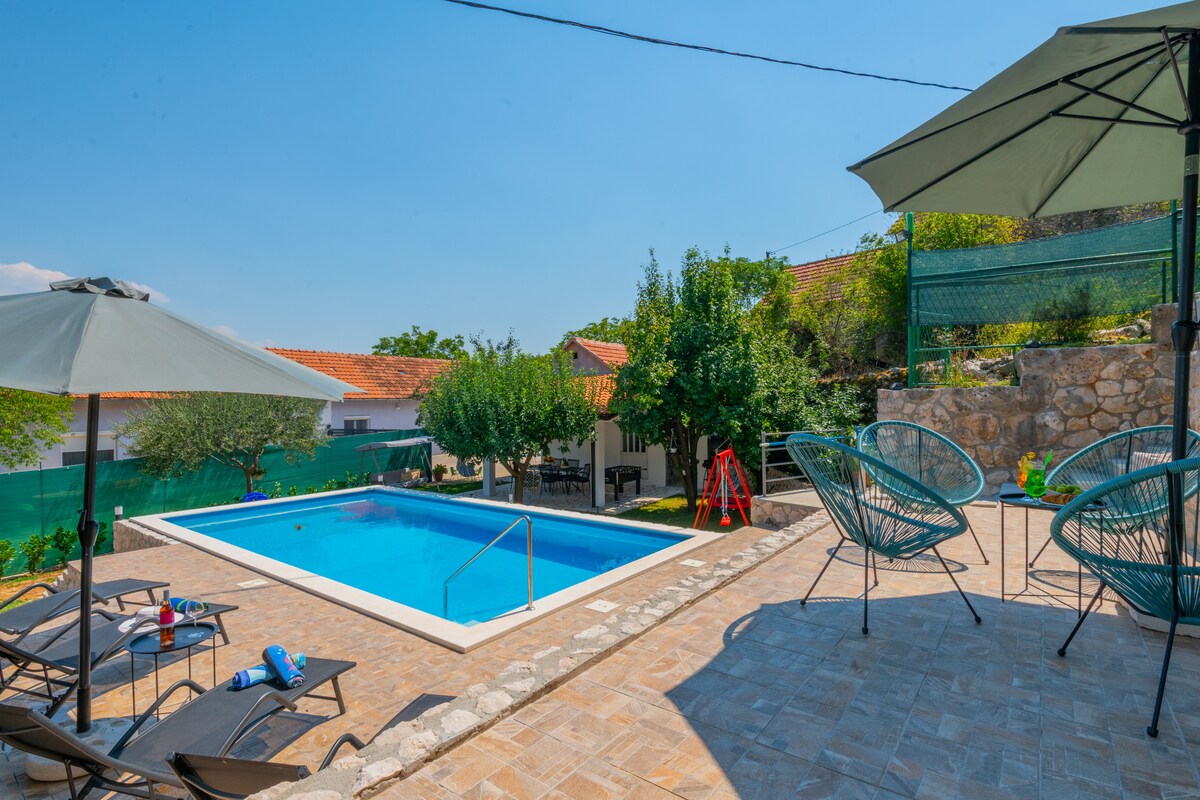 Holiday house with pool - ZELA - offers you peace & privacy with everything you need for a perfect holiday. Located on a large fenced property, ideal for up to 8 people, especially for families with children. The poo & outdoor barbecue create the perfect scenery for shared meals, laughter and relaxed evenings under the sky. Nearby you will find a river, promenade, children playground and sports fields, so everyone can find something for themselves - whether you want an active holiday or peace.