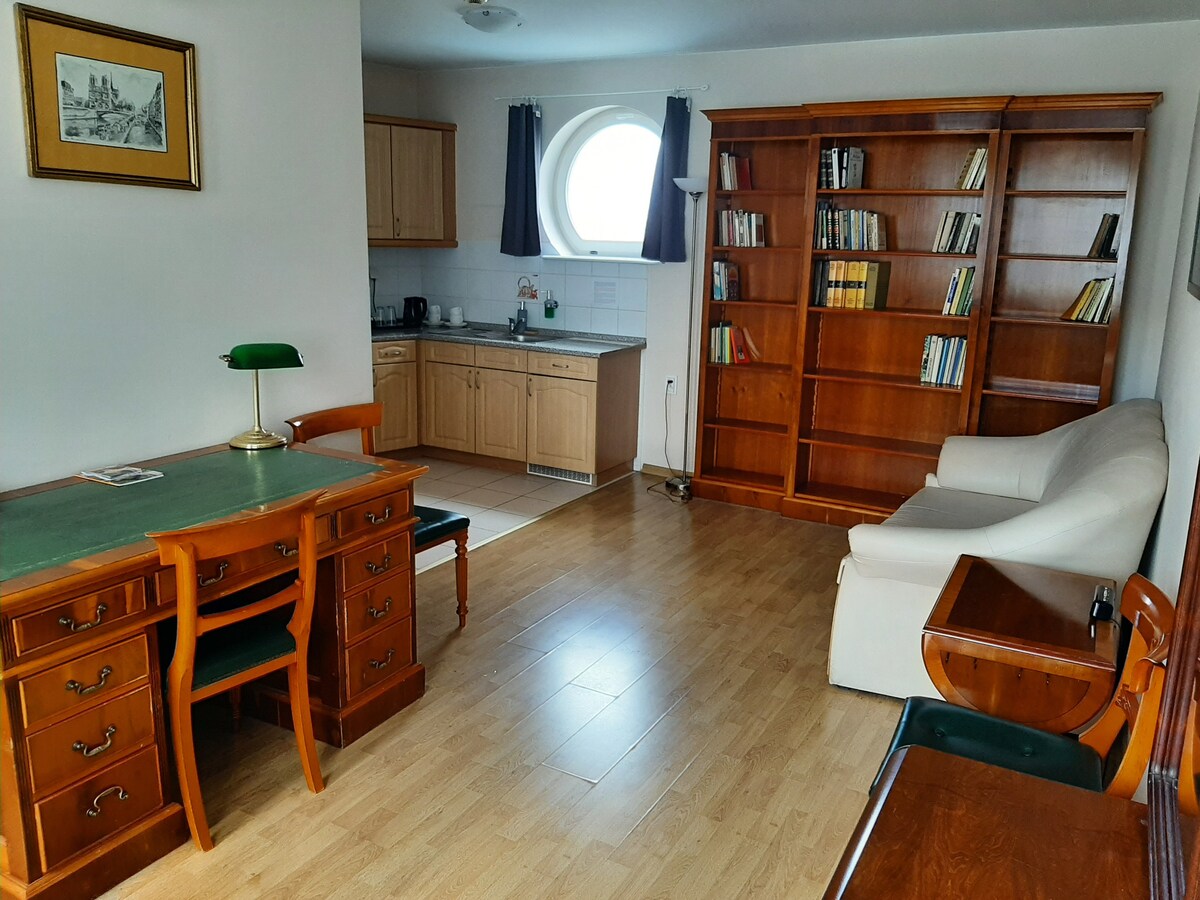 This is a studio apartment with independent entrance in a detached house. This house is located on a very pretty, quiet street at the wall of horse racing. A totally unique place. The apartment has an entrance hall, room, bathroom, mini kitchen, warderobe and a terrace. Very comfortable for 1 - 4 people. There is an extra payment of 10 euro for the third and fourth person as well as for the second one that needs a separate bed. For a dog the additional fee is 20 pln per day.
