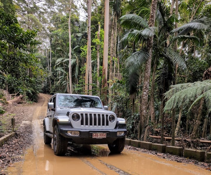 Guida una jeep decappottabile nella natura lussureggiante