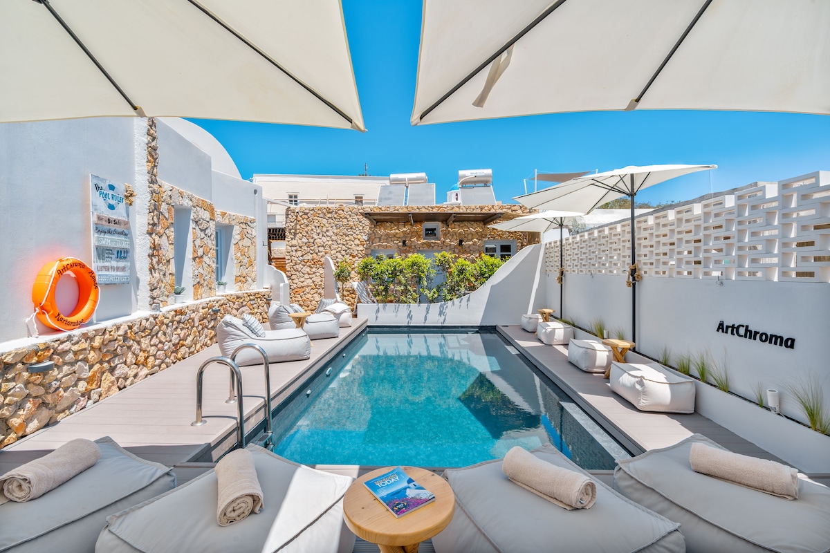 Suite di design nuovissime con idromassaggio privato esterno. Spazioso, minimal con una camera da letto, zona salotto, doccia, angolo cottura e balcone privato con vasca idromassaggio esterna. Situato nel centro di Fira, offre un accesso rapido e semplice alla vista del tramonto sul vulcano, ai negozi, ai ristoranti, alle caffetterie, ai bar, ai musei, alle banche, alla fermata dell'autobus. Gli ospiti potranno usufruire gratuitamente del wifi veloce, dell'app hitech smart tv/netflix e di un altoparlante Bluetooth marshall