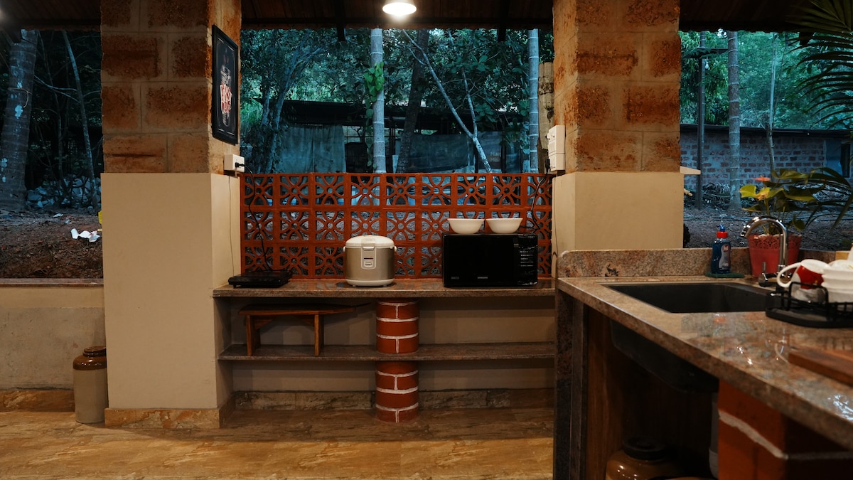 Immersa nell'abbraccio della natura, Tara a Karkala offre una fuga dalla vita cittadina. Circondato da boschi e risaie, dipinge un quadro panoramico perfetto. La casa progettata con un'atmosfera rustica e antica, ma con servizi moderni, realizzati con materiali locali, è completata dai suoi dintorni, facendoti sentire in pace. Svegliati con il suono dei pavoni al mattino. Dietro la casa, un ampio giardino e un laghetto per trascorrere le serate facendo pizza e perdendosi nella natura.