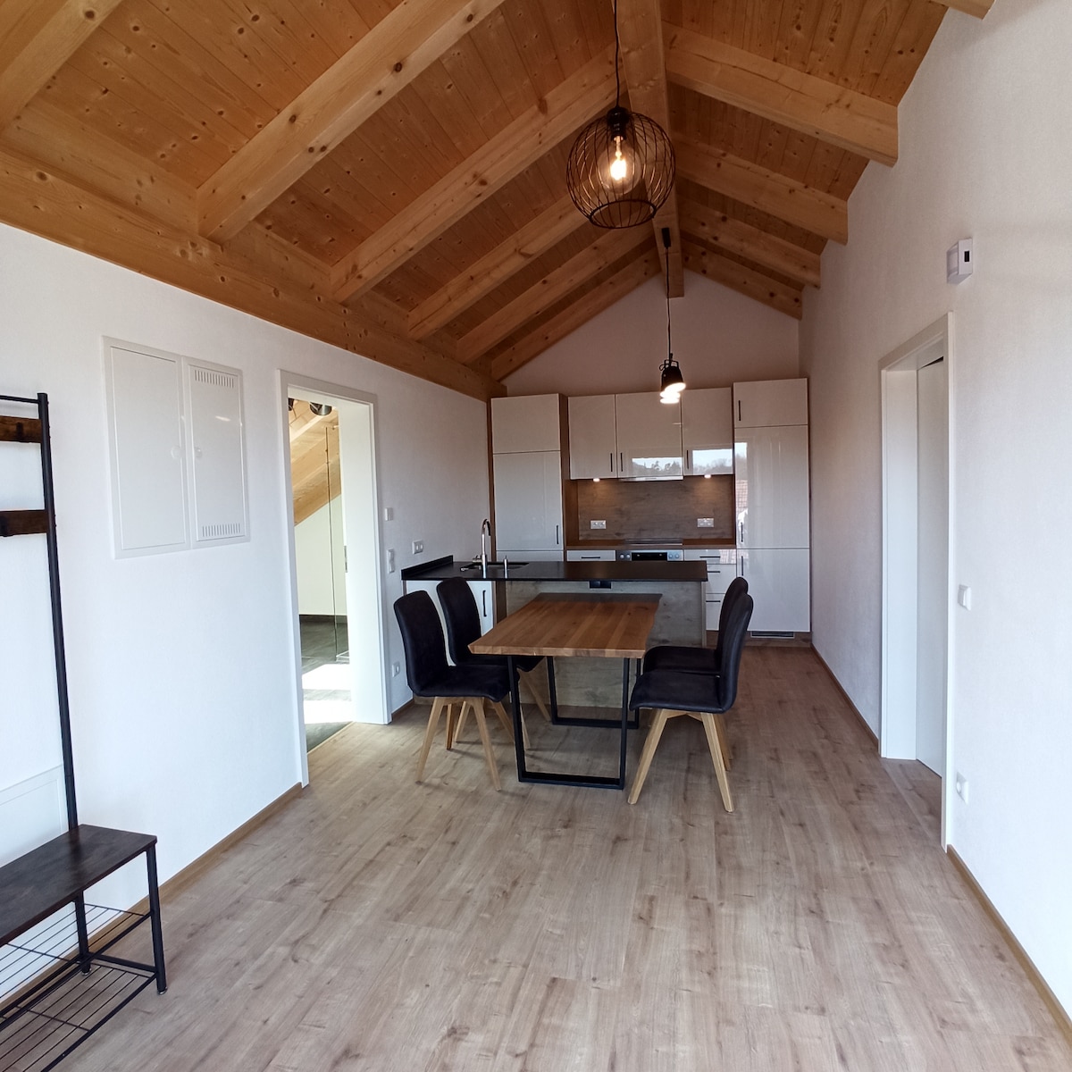 La casa tranquilla per gli installatori e i vacanzieri frugali offre la connessione Wi-Fi gratuita e un ampio balcone con vista sulle Prealpi dell'Alta Baviera. La cucina è completamente attrezzata con frigorifero, lavastoviglie, forno, macchina per il caffè e bollitore. Un grande tavolo da pranzo completa l'ensemble. Il soggiorno separato con TV/ canali satellitari e comodo divano, come la cucina, ha accesso diretto al balcone arredato.
