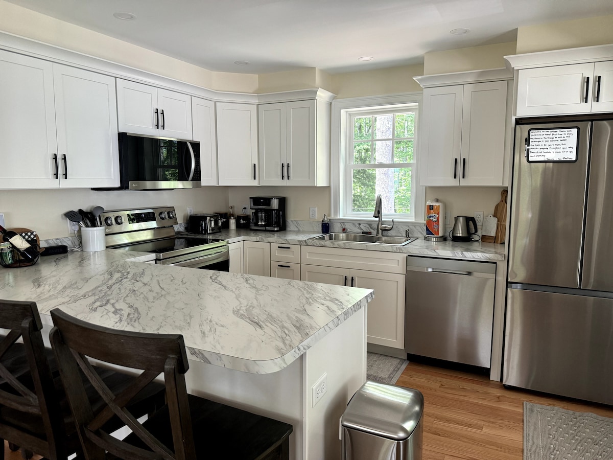 Cottage di nuova costruzione tutto l'anno a Kennebunk che offre banconi in granito, cucina completa con elettrodomestici in acciaio inossidabile, completa di elettrodomestici essenziali aperti al soggiorno con WIFI e accesso alla TV via cavo. Camera da letto privata con letto matrimoniale. Sono forniti lenzuola e asciugamani . A pochi passi da Kennebunk, dai ristoranti locali, dal centro città, dalle spiagge e dalle attrazioni locali