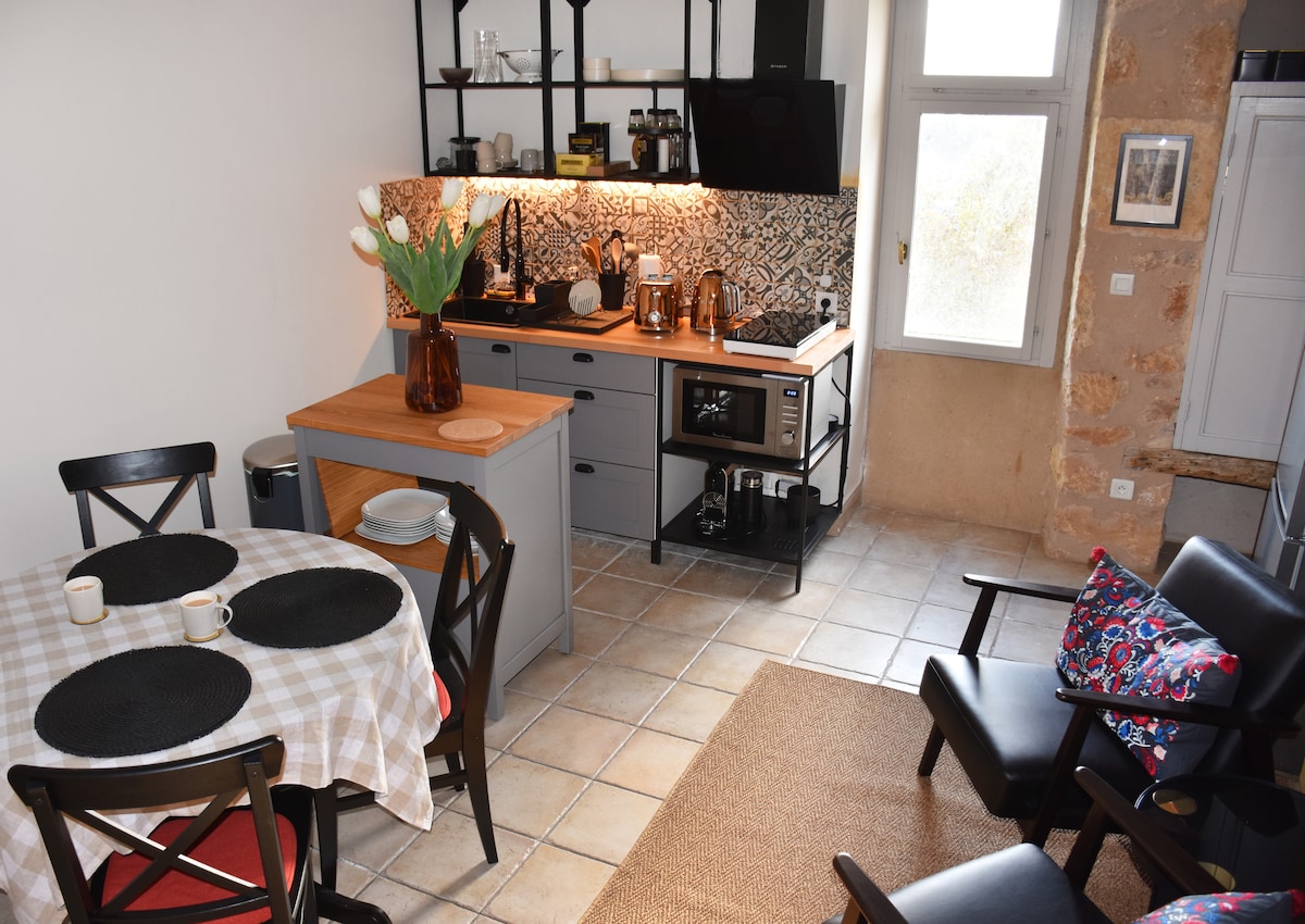 Bâtisse du 18ème siècle offrant un charmant logement indépendant de 35m2 entièrement rénové avec sa terrasse pour prendre un café au soleil le matin. Le studio est organisé autour d’une cuisine ouverte sur un bar en chêne avec un coin salon et TV connectée. La chambre avec literie Buletex et salle de bain en pierre. Vous serez au calme tout en étant à moins d’un kilomètre des commerces et baignades dans la Dordogne. A proximité des plus beaux villages de France, châteaux et jardins.