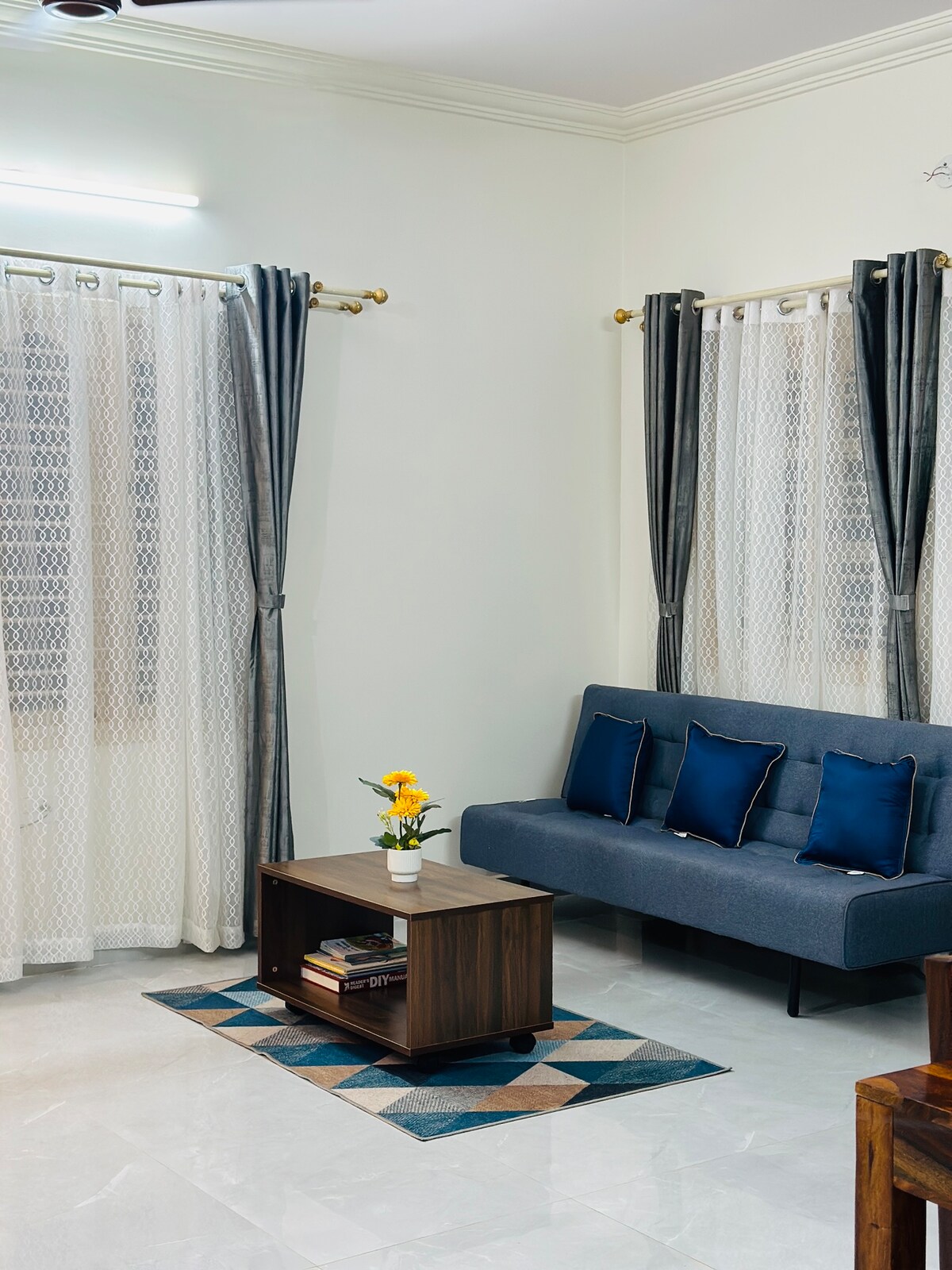 Welcome to our brand new, spacious 2-BHK apartment, ideal for families and couples seeking comfort and convenience. The bedrooms have king / queen size beds with soft orthopedic mattresses for a restful night's sleep. Relax in the large living room with a 43-inch Smart TV, lightning-fast WiFi and a dedicated dining area. Comes with two super clean bathrooms stocked with bath essentials. The fully equipped kitchen includes high-quality appliances and crockery for your culinary adventures.