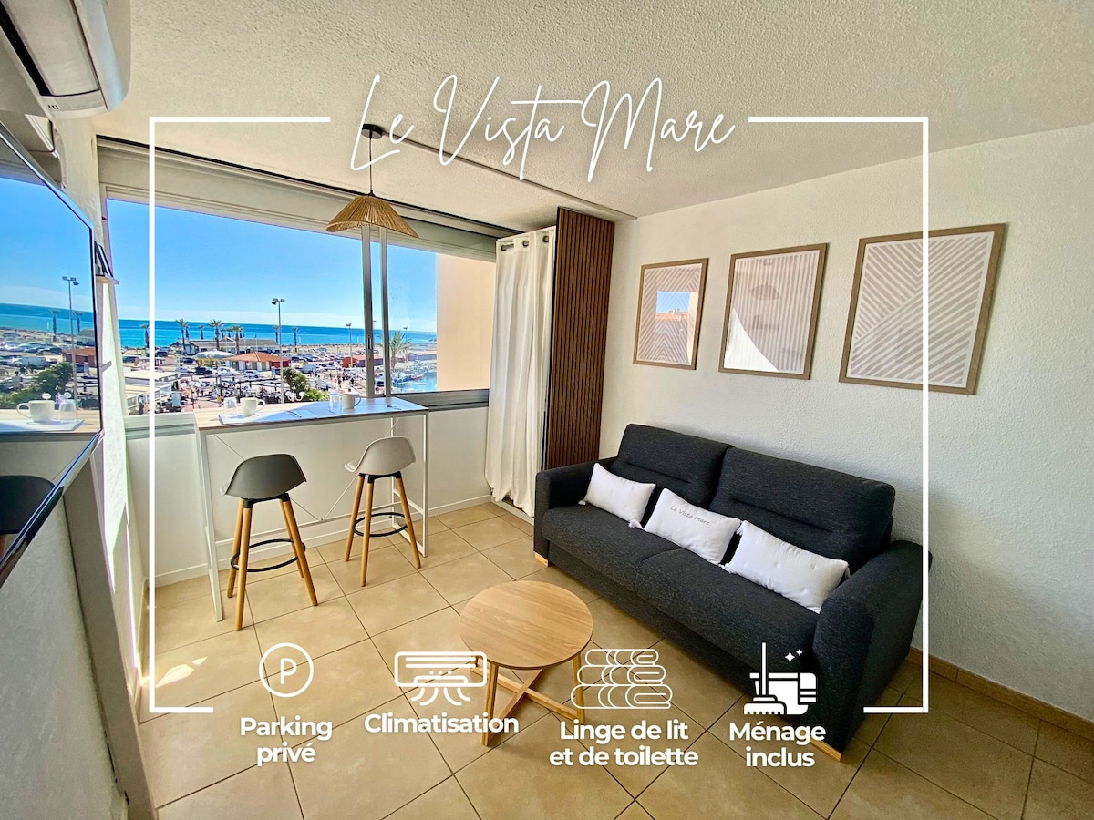 alloggio ristrutturato situato al 5° piano (38mq+10mq terrazza)- 2 ascensori- parcheggio privato in loco (altezza 1,90m maxi)-tutti i comfort -vista panoramica sul mare dalla terrazza coperta - Nessun dirimpettaio - Accesso diretto alla spiaggia - 1 camera da letto letto matrimoniale 140 - 1 zona notte letto 140 - aria condizionata - cucina attrezzata nuova piano cottura 4 fuochi a induzione, forno a calore rotante - microonde - lavastoviglie, lavatrice asciugatrice - TV connessa - Lenzuola, asciugamani forniti, wifi fibra-