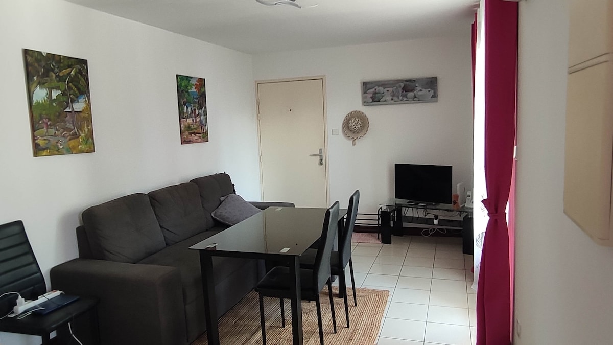 A 10 minuti dall'aeroporto, vicino a qualsiasi esercizio commerciale. Grazioso T2 di 40 m2 +varangue e parcheggio nel seminterrato in una residenza tranquilla e custodita. Clim, TV connessa wifi e Netflix , ottima biancheria da letto ed elettrodomestici nuovi. Contatto possibile noleggio auto.