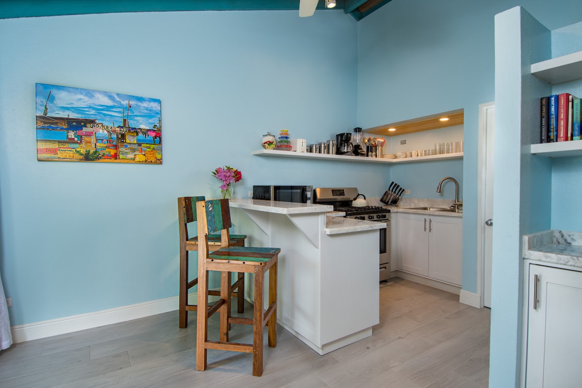 Skipper è un cottage indipendente: un grande alloggio di 42 metri quadri con terrazza di 4,6 metri quadri. Letto matrimoniale, materasso Silver Beauty Rest di Marriott e futon completo, oltre a cucina completa e bagno con doccia. La proprietà è tutta recintata per Skipper, il mio cane da acqua portoghese. Skipper era il capitano della nostra barca Skedaddle. Il cortile è molto lussureggiante e verde, sembra una mini foresta pluviale in città. Il nostro alloggio è in vecchio stile caraibico, cottage in legno, senza cemento. Skipper e Skedaddle sono due cottage identici uno accanto all'altro.
