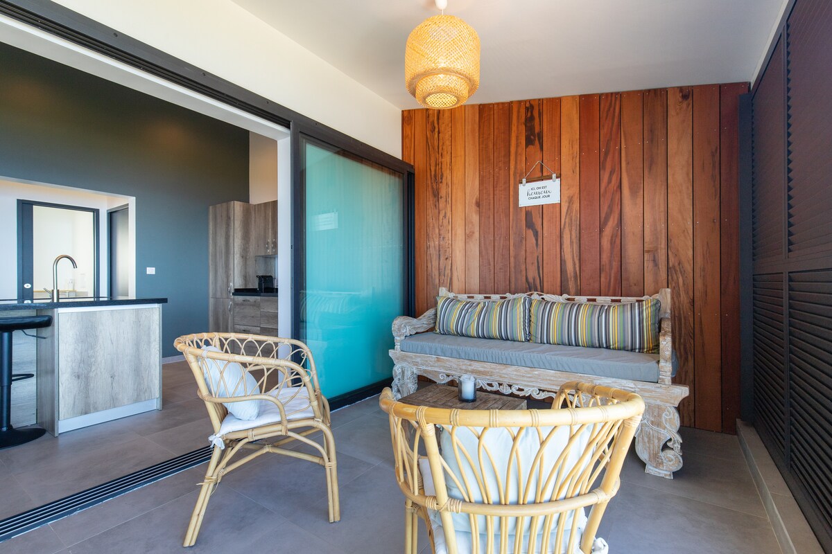Godetevi questo appartamento di lusso in riva al mare a St Pierre ideale per un soggiorno rilassante. Sun set dal vivo. Offre 2 camere da letto climatizzate + bagni e servizi igienici privati, cucina attrezzata, cantina e bar mobile per aperitivo in terrazza, tacco luminoso fronte mare e terrazza per godere della vista sull'oceano. Posizione eccezionale. Facile accesso alla spiaggia per momenti unici vicino al mare. In coppia, in famiglia o con gli amici questo appartamento combina comfort e autenticità.