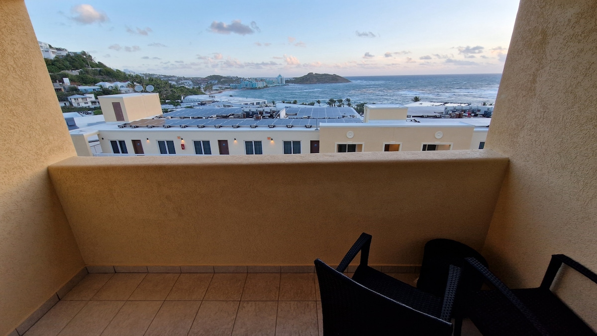Una spaziosa e pulitissima suite condominiale deluxe con pavimenti in marmo, cucina completamente attrezzata con piani di lavoro in granito e un ampio balcone in piastrelle di argilla italiana con vista sull'Oceano Atlantico e sulla francese St. Barths, in una rinomata struttura di Dawn Beach.