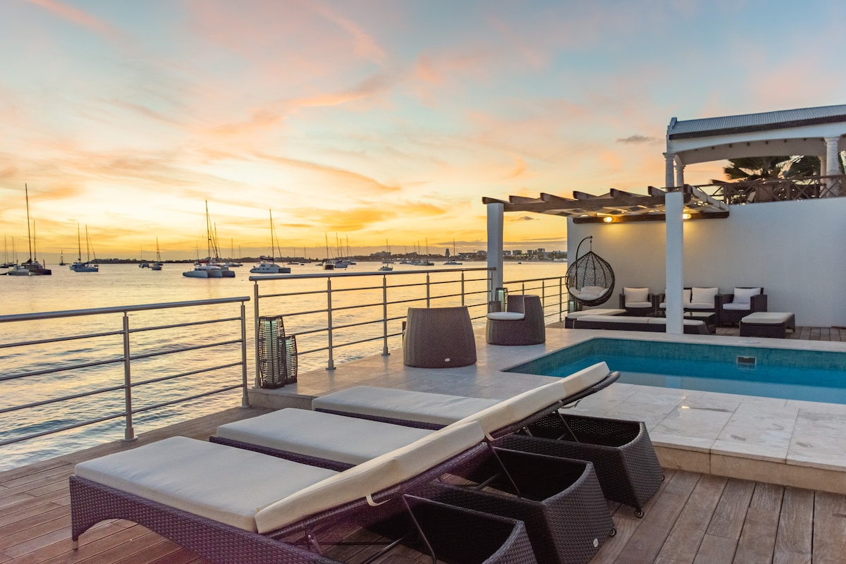 Appartamento con vista sull'oceano, ampia camera da letto principale con letto king-size e balcone, situato in posizione perfetta vicino al Simpson Bay Bridge. Zona tranquilla a pochi passi da tutto. Goditi un tramonto perfetto sul Mar dei Caraibi