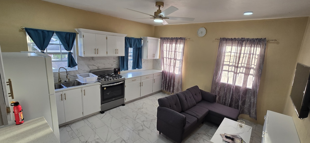 Comfort and convenience with a panasonic island view. Two cozy bedrooms featuring queen sized beds and two spacious and clean bathrooms A fully equipped kitchen and comfortable dining and living area leading to a neat terrace with views from the lush forage of Nevis Peak to sister island St. Kitts. Easy access to beaches, natural hot spring, restaurants, historical sites and all amities/services the island’s capital has to offer.