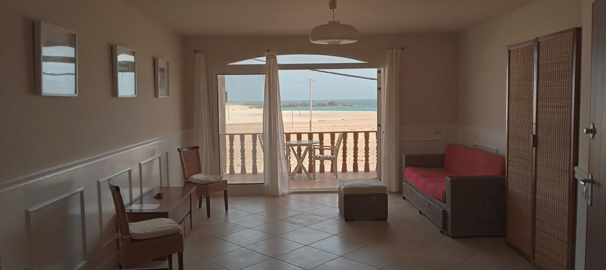 Bellissimo monolocale di lusso (suite), direttamente sulla spiaggia: ampio letto matrimoniale molto confortevole, bagno con doccia, angolo cottura. TV via cavo, wifi, aria condizionata e colazione, veranda privata, spiaggia, giardino e parcheggio. Molto luminosa, ideale per rilassarsi e per coppie romantiche. Questa suite si trova a 1 km dall'aeroporto e da Rabil, a 6 km da Sal Rei e a 400 metri dal famoso Beach Club Bar Ristorante "Perola de Chaves"