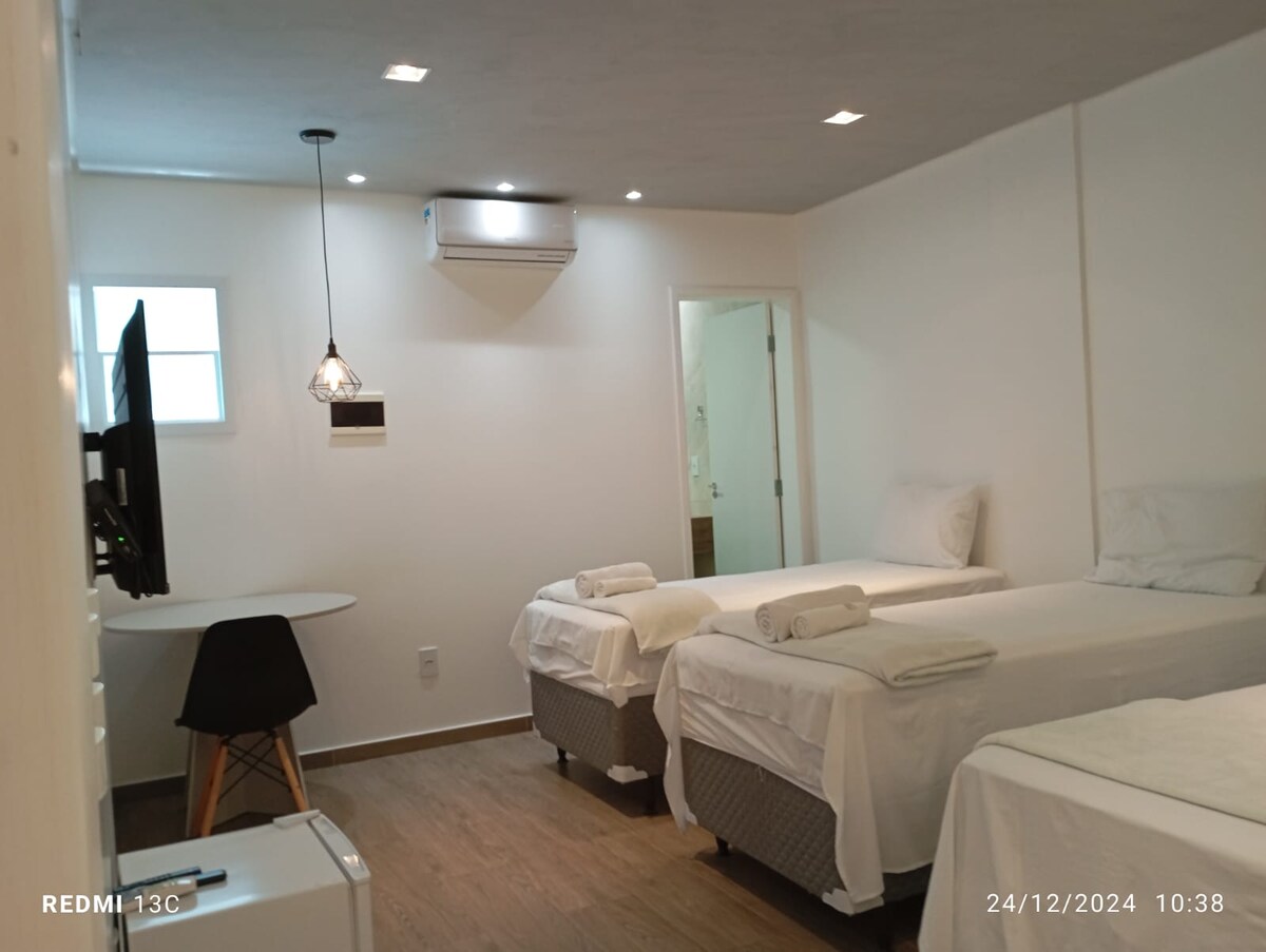 Este lugar sofisticado oferece tudo o que você precisa para ter uma estadia luxuosa. * CAMA CONFORTÁVEL * SMART TV * WI-FI * AR-CONDICINADO * FRIGOBAR * CHUVEIRO ELÉTRICO * GUARDA ROUPAS * ESCRIVANINHA