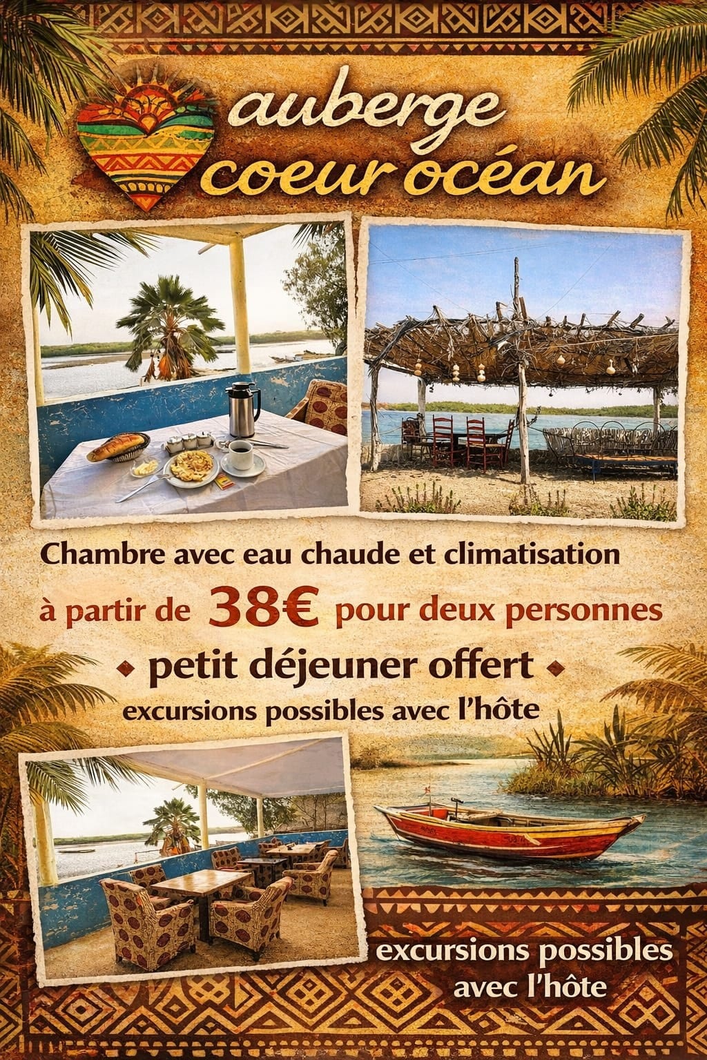 Bienvenue au Cœur Océan,nous vous offrons des chambres climatisées ,eau chaude ,petit déjeuner compris prêt de la mangrove pieds dans l'eau dans un endroit calme et distrait ,nous organisons des journées d'excursions en mer avec menus complet et randonnées pédestres, nous sommes à 15mn de l'île au coquillage,le plus grand Baobab du Sénégal, Quai de pêche de belles plages une cuisine naturel grillade un Bar avec des jus naturels 100% de chez nous...sorties proposé par le service merci.