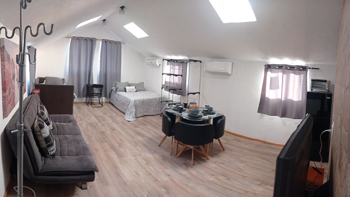 Si tratta di un comodo mini loft, con dettagli in legno e con tutti i comfort per ospitare uno o due ospiti al massimo, con garage per un'auto con cancello automatizzato, situato in una zona residenziale chiusa e con sorveglianza, nella zona nord di Saltillo e vicino a centri commerciali, università (UANE) e vari ristoranti che puoi anche raggiungere a piedi. Si tratta di un alloggio con una posizione eccellente vicino a tutto e con accesso vicino alle principali vie veloci.