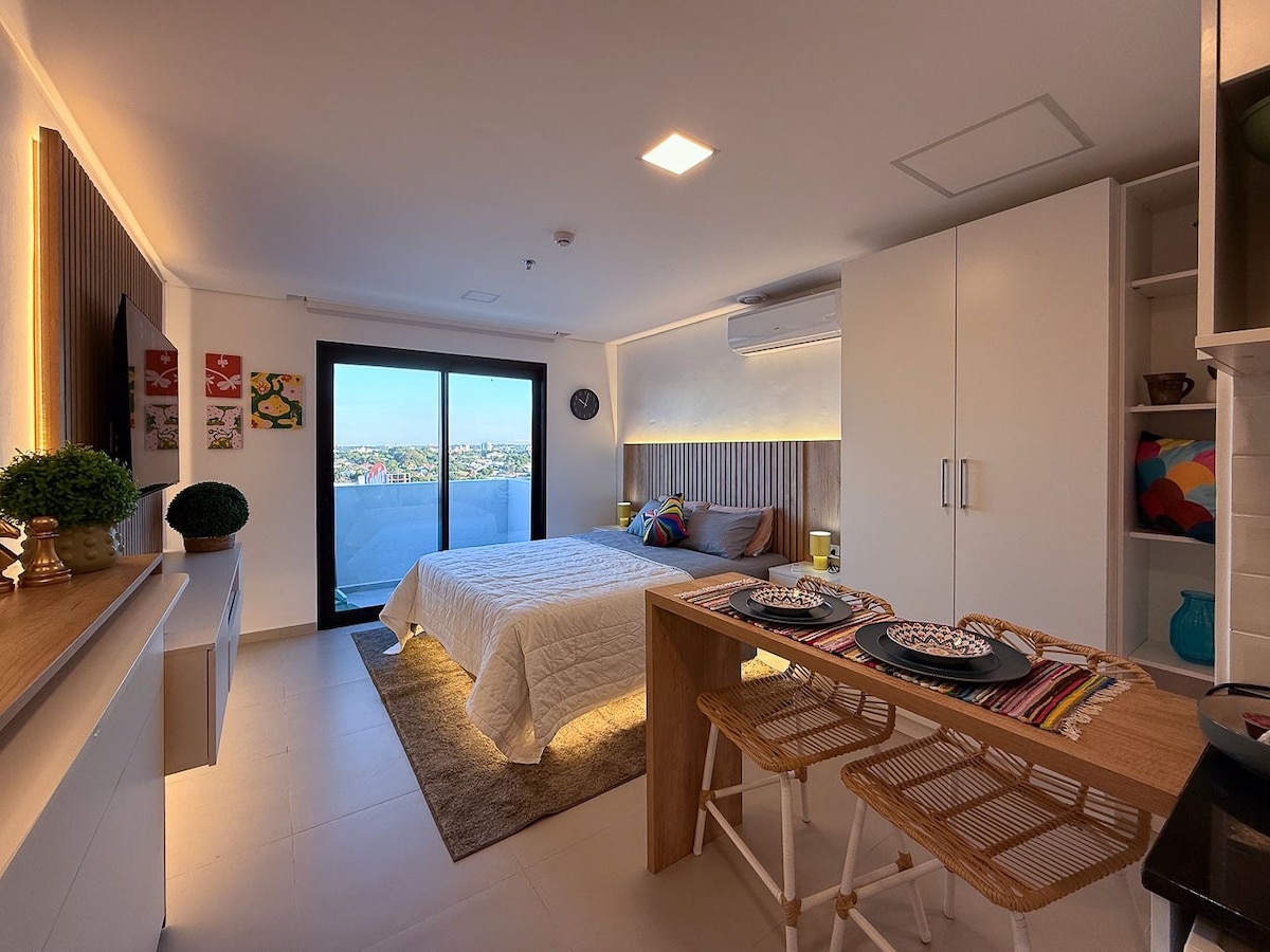 Appartamento situato a un piano alto, con balcone e vista libera, completamente attrezzato per un soggiorno confortevole: - Letto king size con materasso rigido ad alta densità - Area di lavoro con scrivania e connessione WiFi - Smart TV da 55 pollici - Terrazza sul tetto con piscina e palestra - Quincho - Lavanderia - Sicurezza 24 ore su 24 Una posizione eccezionale: - Situato nell'asse aziendale, a soli 5 minuti da Shopping del Sol e Paseo La Galería - A 15 minuti dall'Aeroporto Internazionale Silvio Pettirossi