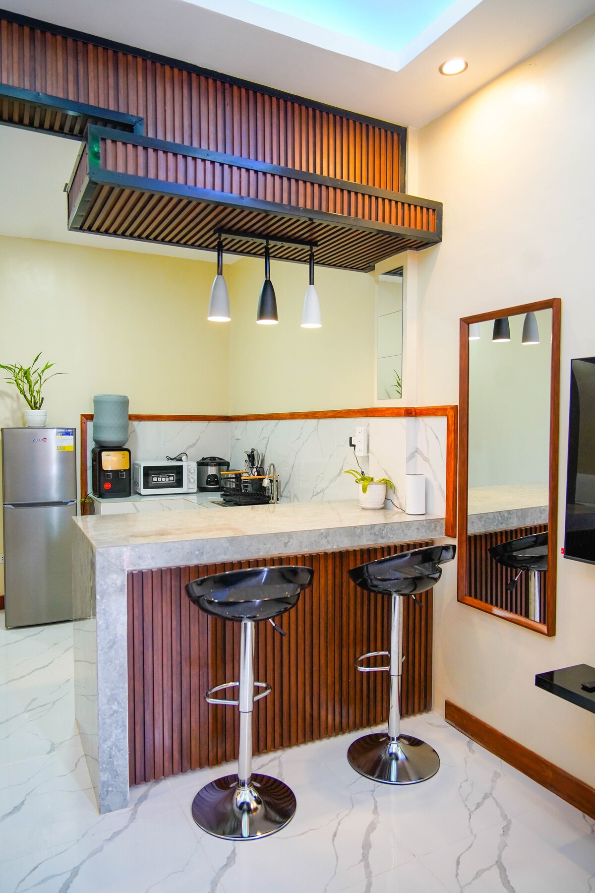 Kick back and relax in this calm, stylish tiny house. Fully air conditioned home with parking, kitchen, outdoor shower and grill. Furniture includes a Queen bed, 3 seater sofa, 3 dining chairs, foldable dining table, wardrobe cabinet with drawers, study table (convertible to vanity with mirror) with a chair. A valid government ID may be required especially for longer stays.