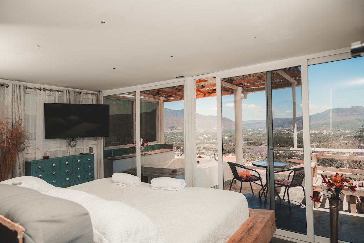 Chalet in legno in stile suite con vasca idromassaggio. Situato sulle montagne di Antigua Guatemala, all'interno del bellissimo giardino di lavanda "Jardines de Provenza". Goditi una vista eccellente sui tre vulcani (Agua, Fuego e Acatenango). Immergiti nei campi di lavanda e nel loro aroma incomparabile, circondato da splendidi paesaggi e tramonti. Puoi esplorare il sentiero "Shinrin Yoku", appositamente progettato all'interno della foresta naturale. Ci troviamo a 12 minuti da Antigua Guatemala.