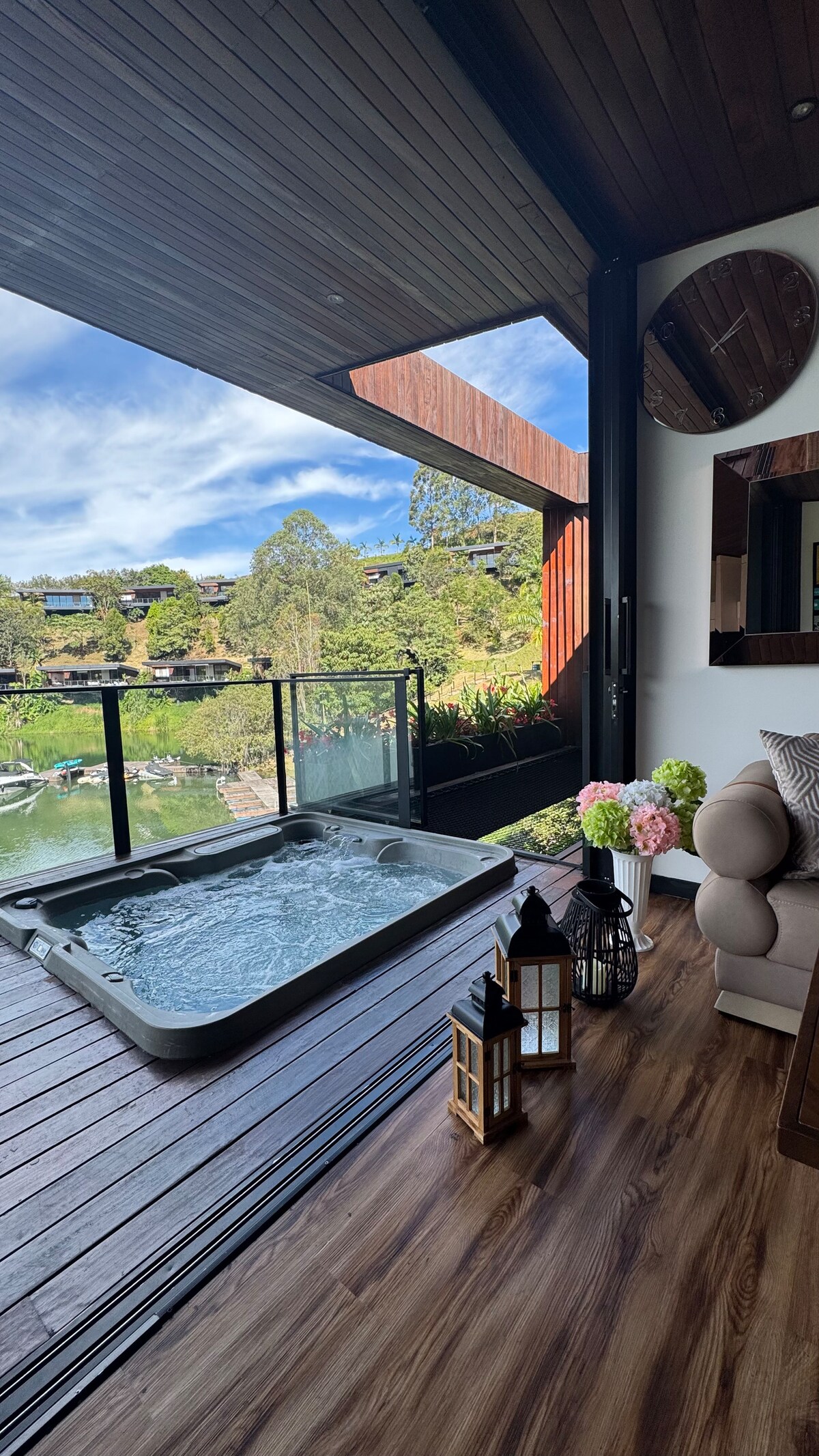 Immergiti in un'esperienza unica nella nostra baita di lusso a El Peñol, con una vista impareggiabile sul bacino idrico e La Piedra, circondata dalla natura e dalle montagne. Goditi la vasca idromassaggio privata, rilassati sull'amaca del catamarano, prepara i tuoi piatti preferiti nella cucina attrezzata o nell'area barbecue e resta sempre connesso con il nostro WiFi ad alta velocità. Un luogo pensato per il riposo, il comfort e la disconnessione in coppia o in famiglia.