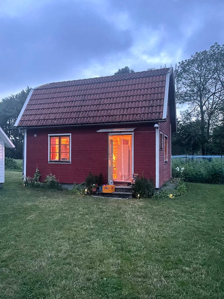 Mysig stuga nära hav, äng och skog med bastu.