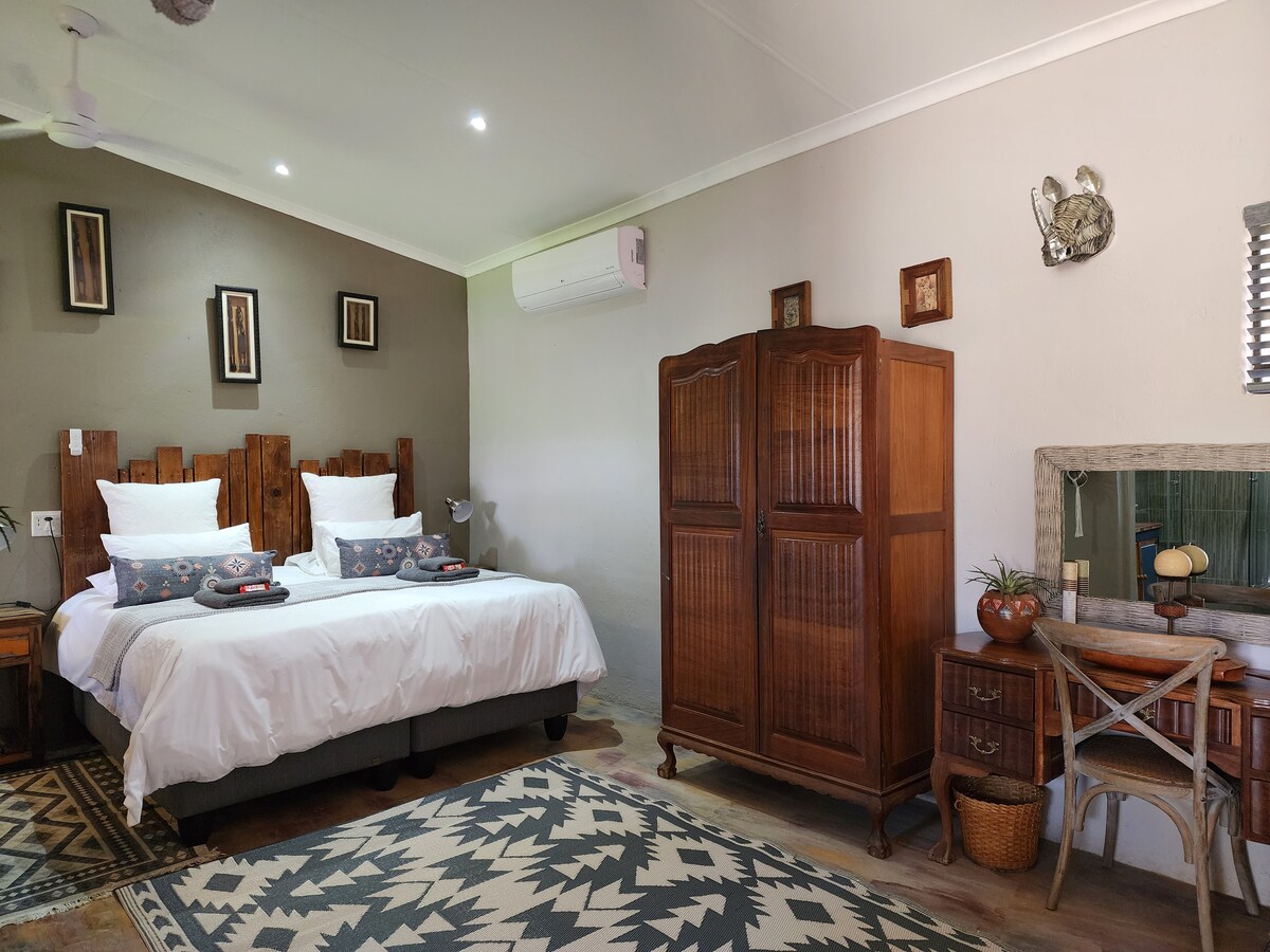 Shumba è un cottage con giardino in stile africano, ideale per una famiglia. È composto da due camere da letto, due bagni (privati) con cucina completamente attrezzata e un piccolo salotto. (Può ospitare 6 persone: 4 adulti e 2 bambini) Configurazione letto: 2 x King O 1 King + 2 singoli O 4 x singoli (camera da letto) + 2 x divani letto singoli nel salotto *Solo 1 posto auto per unità. Siamo situati a 6 km dal Parco Nazionale di Pilanesberg e a soli 20 km dal centro di intrattenimento e dal casinò Sun City.