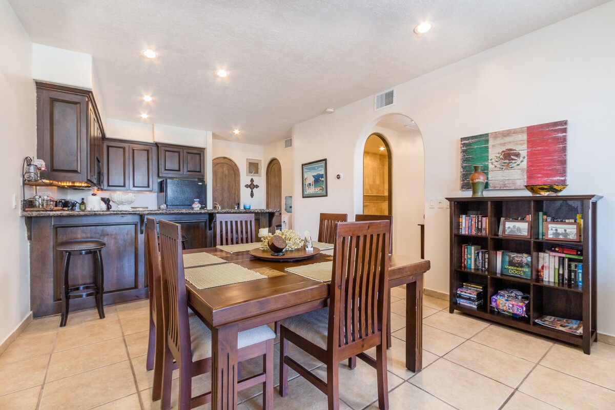 Grande unità con 1 camera da letto al 2° piano con vista diretta sul Mare di Cortez e oltre dall'interno dell'appartamento e dal grande patio coperto. L'appartamento dispone di una cucina rinnovata con elettrodomestici, gadget, stoviglie e utensili. 1 letto king-size nella grande camera da letto principale. Nuovissima e bellissima cabina doccia con panca integrata in bagno. Leggero, luminoso, colorato e tutto tuo per tutto il tempo che desideri! Spero che ti piaccia tanto quanto piace a me!