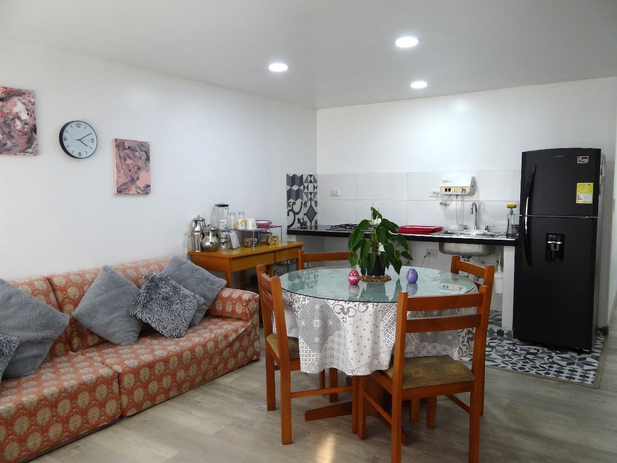 Disfruta de este hermoso alojamiento tranquilo y céntrico. Apartamento de 41 mts2 nuevo a estrenar, cerca de vías de acceso y de transmilenio. Ambiente familiar. Sector seguro con opciones de restaurantes. Si decides cocinar cuentas con excelentes utensilios y filtro de agua potable. Cuenta con WiFi, y agua caliente. Ubicado en un tercer piso con acceso independiente por escaleras. Limpieza excepcional, lugar impecable. Estacionamiento pago en la propiedad. Magnífico para trabajar.