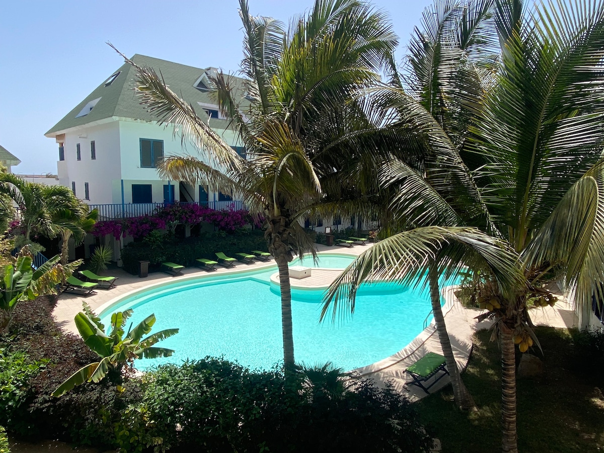 Benvenuti in questo grazioso monolocale situato nel cuore di una residenza alberghiera sicura, perfetta per un soggiorno rilassante sull'isola di Sal. Ideale per una coppia con due bambini o 3 adulti in quanto l'appartamento può ospitare fino a 4 viaggiatori. Questo alloggio tranquillo offre un soggiorno rilassante per tutta la famiglia. Questo monolocale luminoso offre tutti i comfort necessari. Vista diretta sulla piscina dalla finestra
