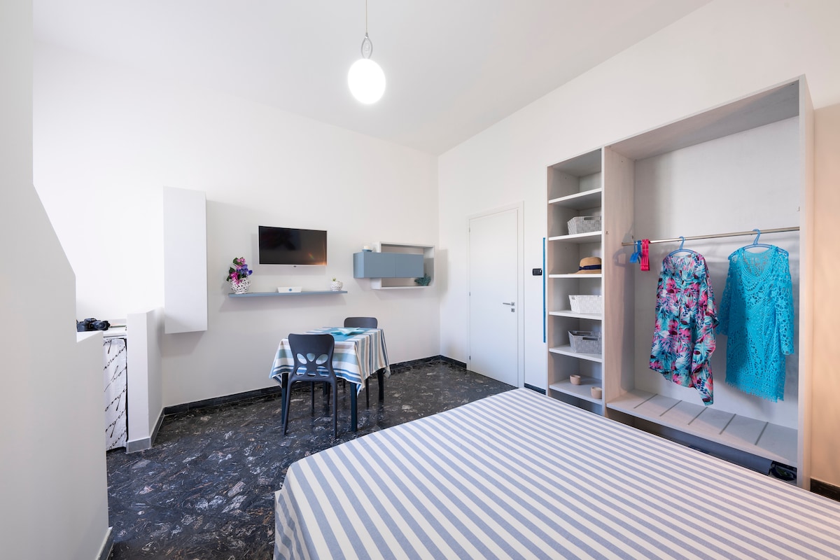 Appartamento fresco, luminoso ed accogliente, con colori freschi e mediterranei. E' dotato di parcheggio interno e di un bel terrazzo con tavolo sedie e doccia esterna. L'interno è composto da un tinello cucina spazioso con cucina in muratura, frigorifero e lavatrice. Da un disimpegno poi si perviene alle due camere da letto e il bagno. Il posto è molto tranquillo per il fatto che la strada è chiusa quindi a servizio dei solo i residenti della strada. Ci troviamo a 500 metri dal mare.