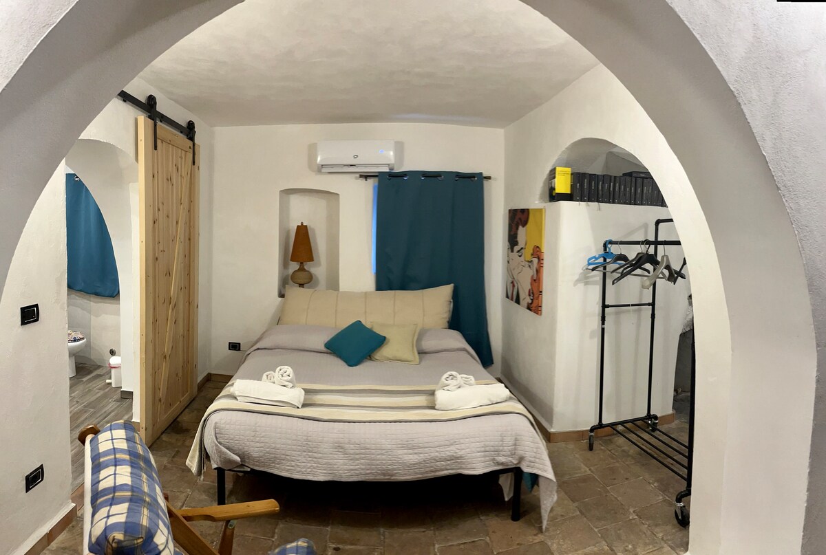 Piccolo appartamento con open space e piccola stanza individuale. Situato a pochi metri dalla piscina. Zona soggiorno all'aperto con tavolo e panche sempre all'ombra di un gelso secolare. Accanto vi è il Museo dell'Olio e della civiltà contadina: oltre 80 giare antiche e attrezzi della vita quotidiana dei secoli passati. Nel nostro uliveto, a 10 minuti dalla casa, si trova il rudere dell'antico monastero bizantino di San Pietro di Deca e l'adiacente area archeologica.