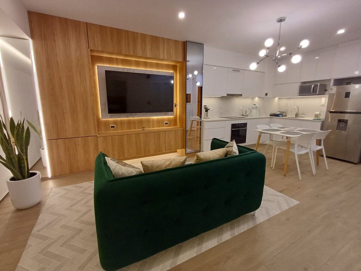 Divertiti, evadi, riposati e lavora in questo spazio tranquillo ed elegante. Avrai a disposizione 2 grandi schermi Smart da 50" e 43" Si trova in una zona centrale e sicura. Dispone di una bellissima terrazza e di una vista sul parco. A pochi passi troverai il centro commerciale, mentre il viale, i ristoranti, la palestra, lo Starbucks e l'ambasciata degli Stati Uniti distano 5 minuti. Wi-Fi, televisori con Netflix, Star+, scrivania, cucina ed elettrodomestici, sicurezza e comfort