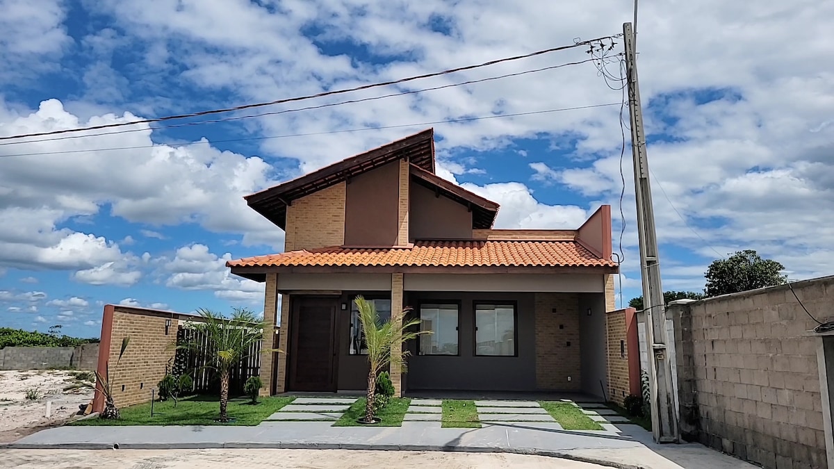 Casa Aconchegante, situata all'interno del Parco Condomínio Dunas, 4 suite: 2 con bagno e balconi reversibili, biancheria da letto e vasca completa, tutte con aria condizionata, docce elettriche, armadietti e amaca. Piscina completa: piano cottura con forno, friggitrice ad aria, frullatore, pentole, bevitore d'acqua, barbecue, armadietti da cucina e grande tavolo da pranzo. Soggiorno: divano con TV. Area ricreativa:con piscina privata, sedie a sdraio, doccia e net-owners.