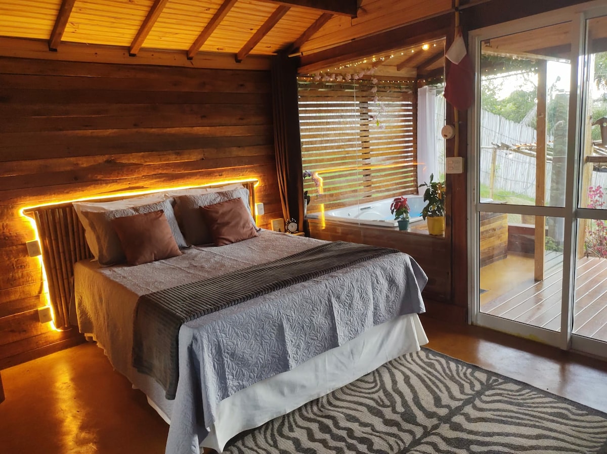 Riconnettiti con la natura in questo luogo indimenticabile. La capanna GK situata sulla tangenziale della foresta ha un ingresso affascinante e ogni comfort interno. Letto matrimoniale, camino, doppio idromassaggio, lenzuolo termico, TV 43", balcone con rete e con una vista meravigliosa e con tutta la sicurezza e tranquillità di 1 acro. Inaugurato il 26/04/22. Vedi anche altre 2 unità. Per coppie: https://www.airbnb.com/h/chalesperpetuanatureza e https://www.airbnb.com/h/cabanadentrodaflorestand. Accesso tutto con asfalto