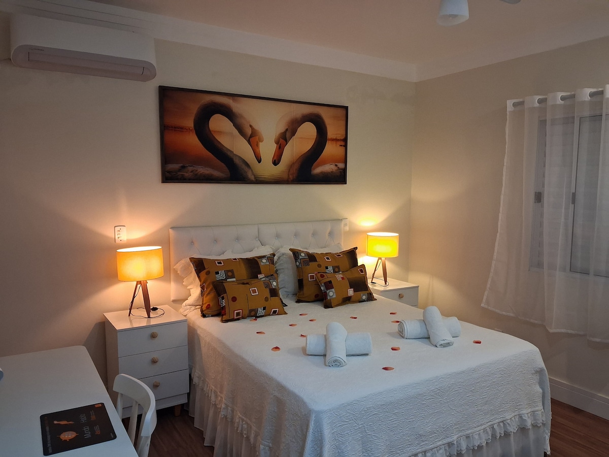 Piso moderno con balcón,( aire acondicionado de pago) cocina y salón juntos + colchon extra, chimenea, sofá, 2 escrivaninhas, dormitorio 20mts, cama queen size 1,60, almohadas de viscoelastico, Smart TV50Sansung, cocina totalmente equipada, cafetera, horno, tostadora, sandwichera, horno eléctrico, todos los electrodomésticos, sartenes, olla a presión, detector de humo, garaje privado techado, lavadero de 10 metros y pequeño jardín, alarma, cámara de seguridad, c. eletrica y portón electrónico.