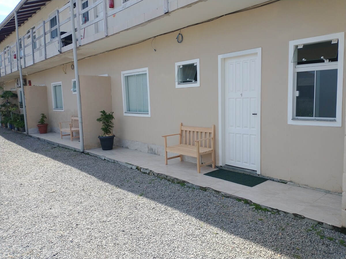 Situato a 14 km dal centro di Florianópolis e a 20 km dalla spiaggia più vicina per fare il bagno. Ideale per una persona o una coppia. Ottimo ambiente per riposare, posto sicuro con ampio parcheggio in comune. Monolocale con camera da letto, cucina e bagno privati. Vicino a supermercato (aperto fino a tardi!), panetterie, centro sanitario, chiese. Due linee di autobus dirette per il centro di Florianópolis. Facile accesso per Uber.