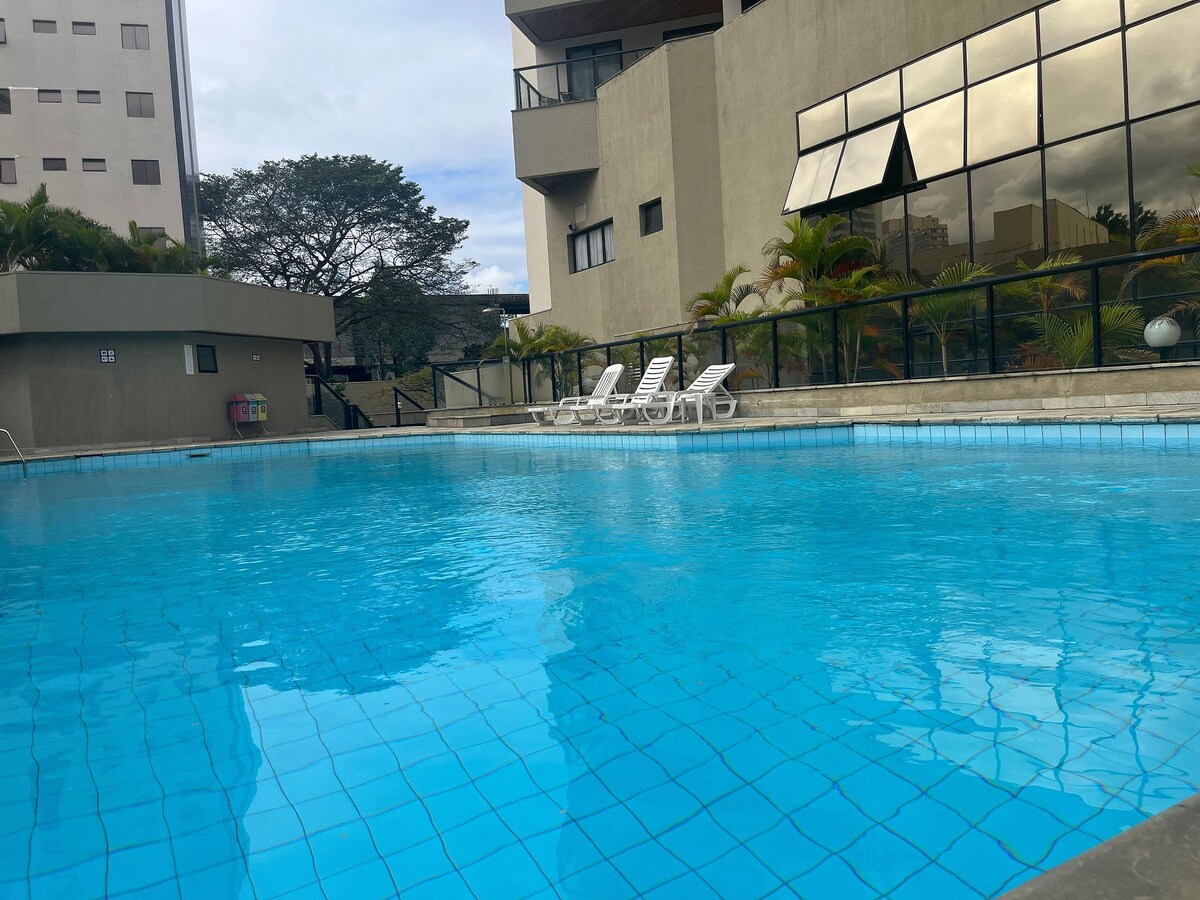 Si trova nel centro di São José dos Campos, vicino al centro commerciale Vale, CTA e facile accesso a Dutra. L'appartamento dispone di: - Cucina con forno a microonde, forno, frigorifero e piano cottura. Un banco per pasti da 2 persone; - Soggiorno con TV via cavo, internet e divano; - Camera con letto, armadio, cassaforte e aria condizionata. L'edificio dispone di piscina, sauna e palestra che possono essere utilizzati dagli ospiti e dispone anche di servizio di pulizia giornaliero in loco