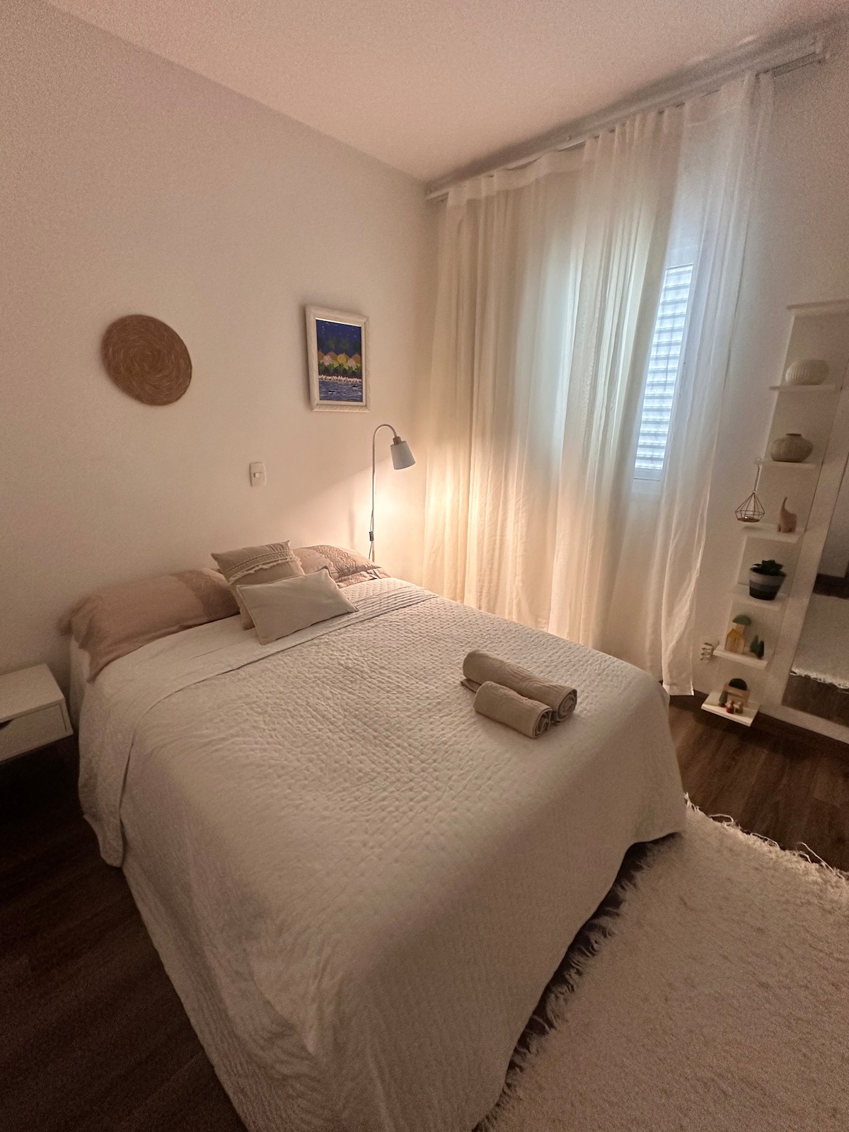 Monolocale 32m2, accogliente e completo. Letto matrimoniale, aria condizionata, WIFI 230 MB, riscaldamento a gas, smart TV con Chromecast, utensili da cucina completi, macchina per il caffè elettrica, soggiorno con divano e scrivania, culla portatile. Vista libera sulla piazza e centro di Jd.Colinas. Parcheggio coperto, piscina, lavanderia sociale, palestra, spazio Home Office con WIFI e portineria 24 ore. Dispone di serratura elettronica e 1 posto auto coperto. L'edificio dispone di un mini mercato al piano terra con diversi articoli.