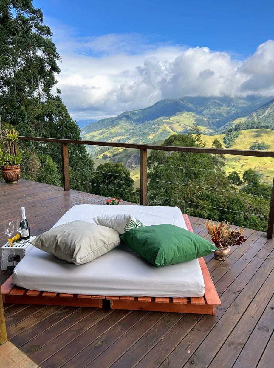 Scopri il fascino della Serra da Mantiqueira in questa baita progettata per contemplare l'alba senza alzarsi dal letto. Rilassati nella nostra spa riscaldata, osservando le stelle sulla rete sopraelevata e altalena. La capanna dispone di una camera integrata con un accogliente letto matrimoniale. Nel soggiorno/cucina, un comodissimo futon può ospitare altri due ospiti, rendendo l'esperienza ideale per le famiglie. La struttura dispone anche di sentieri e piccole cascate.