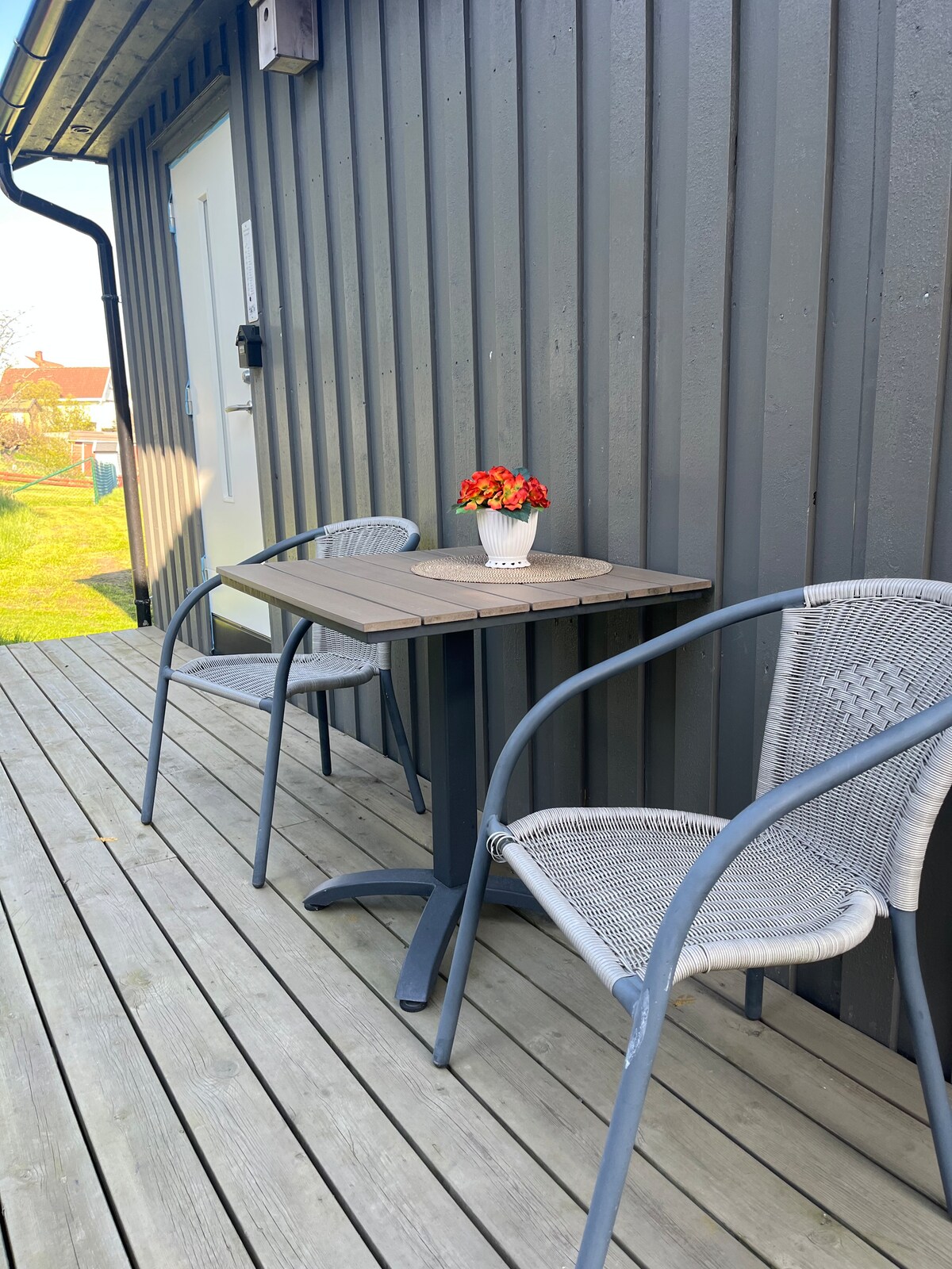 Lite hus med egen terrasse.