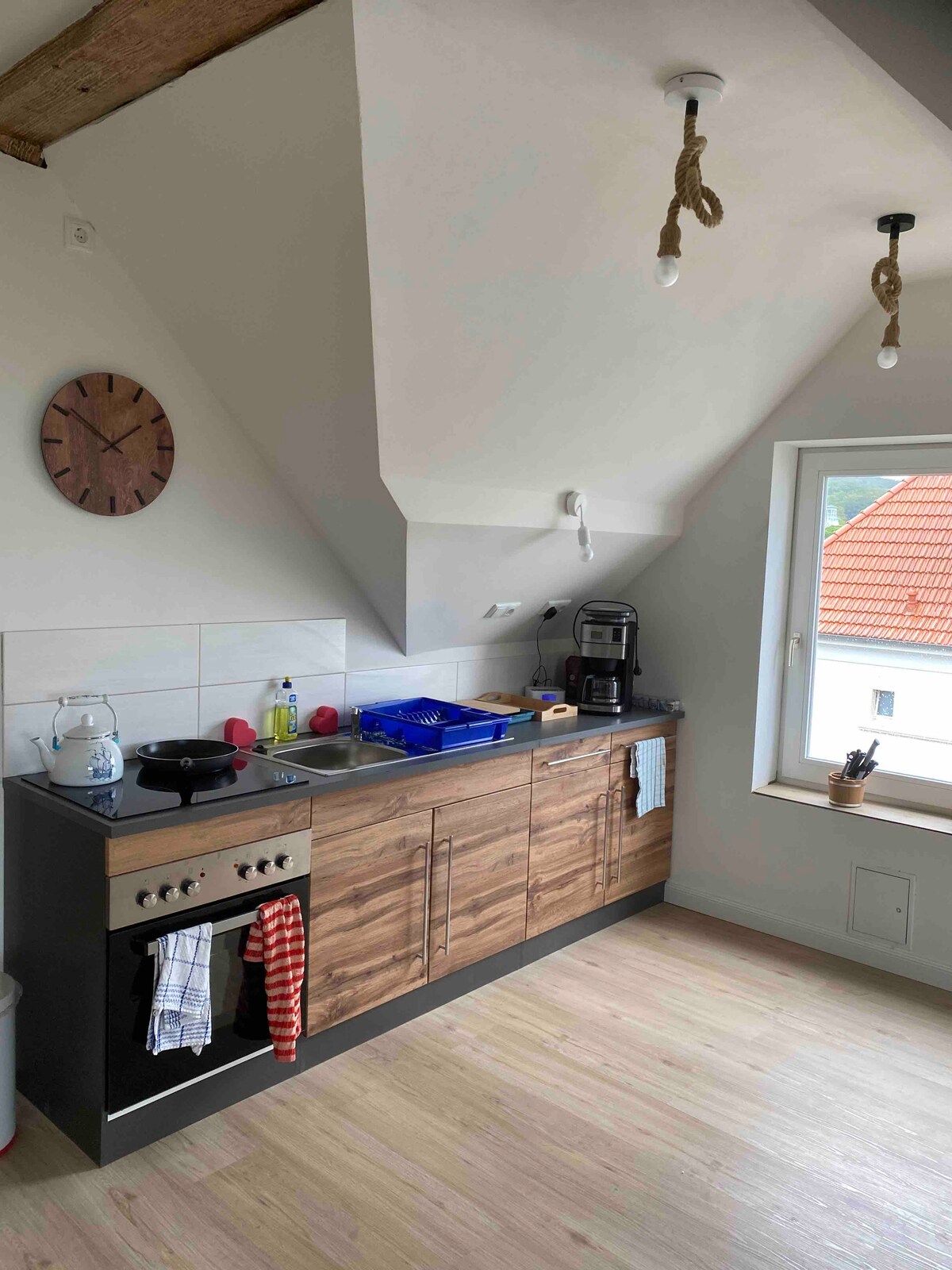 a soli 2 minuti dal mare, nel centro storico di Sassnitz, si trova la casa del cocchiere con un bellissimo giardino selvaggio e una terrazza privata, arredato in stile classico-moderno, stile nordico in un ambiente moderno, un divano con tanti cuscini per rilassarsi e coccolarsi, un grande camino per serate romantiche, un bagno con doccia a filo pavimento, un grande lavandino in pietra e un WC con bidet doccia, un grande letto costruito in legno di spiaggia con vista sulle stelle