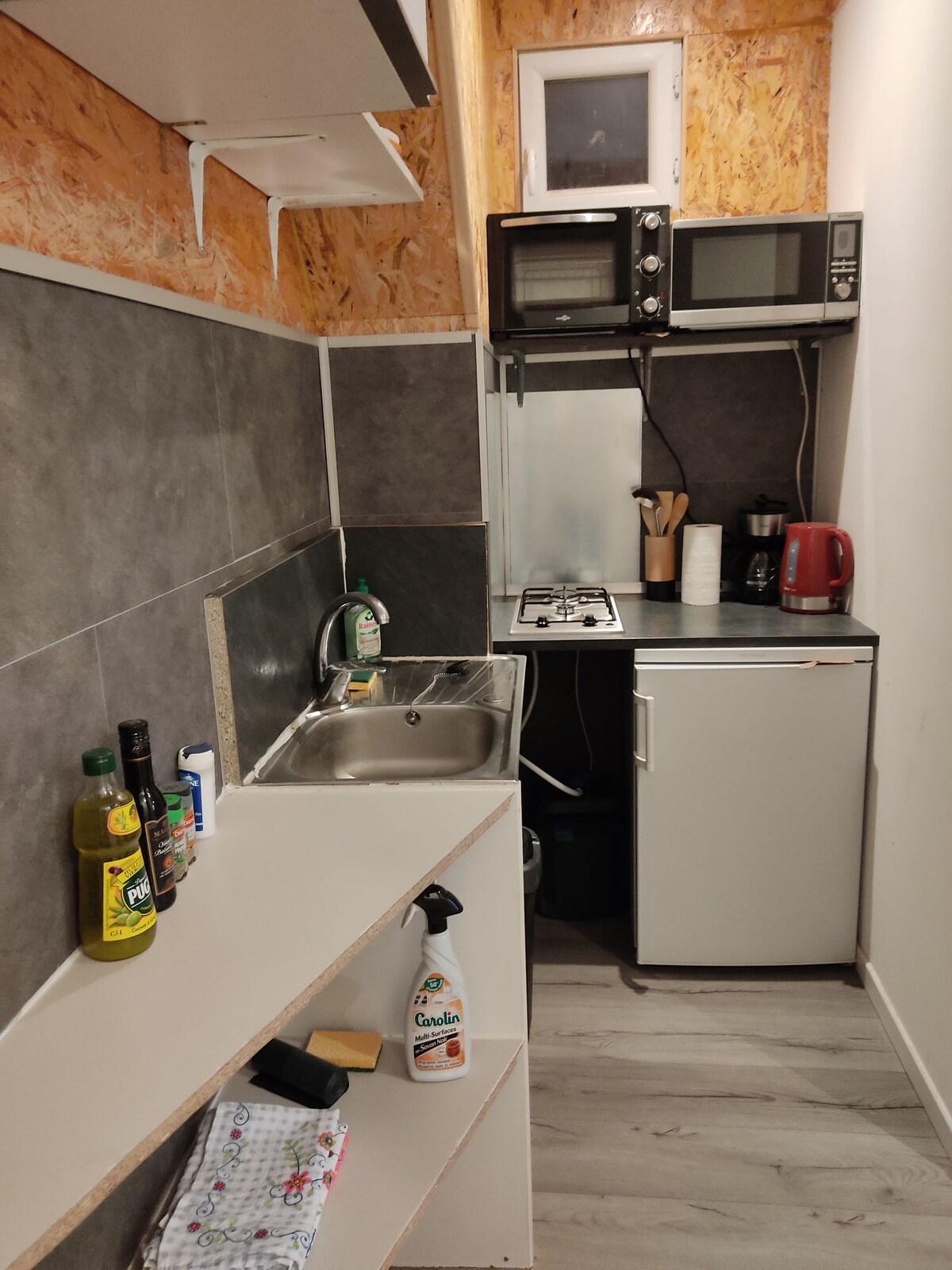 Monolocale indipendente dalla nostra casa. Si entra dal soggiorno con vetrata che offre una bella luminosità e dotato di tende oscuranti per ottenere l'oscurità desiderata. Bella terrazza in legno, riparata. Cucina attrezzata: piano cottura, cappa, forno, frigorifero, forno a microonde, caffettiera, bollitore. Camera da letto matrimoniale, armadio, blocco portaoggetti. Bagno con doccia/lavandino/WC. Posto auto e accesso al cancello dedicato.