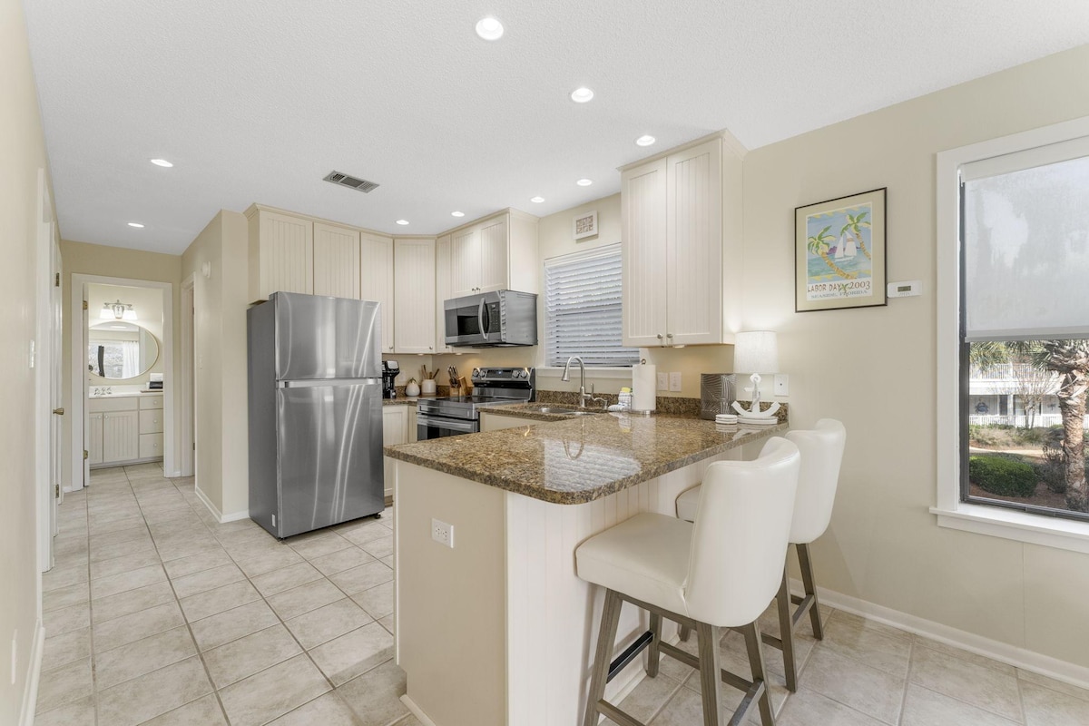 5-7 minuti a piedi dalla spiaggia~centro fitness e piscina in loco~10% di sconto per il noleggio di golf cart~ A pochi passi dai ristoranti~ 2 sedie a zaino da spiaggia fornite~un carrello da spiaggia~2 teli mare Soggiorna all'Happy Hour Hideaway e dimentica le preoccupazioni! Situato sulla famigerata Highway 30a, ti piacerà soggiornare così vicino all'azione pur godendo dell'isolamento di questo complesso. Si tratta di un appartamento con 1 camera da letto, corridoio, letti a castello e 2 bagni, situato al primo piano del complesso.