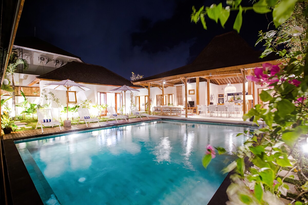 NUOVA vacanza di lusso, ideale per famiglie numerose e gruppi, vicino ai migliori ristoranti, negozi e alla spiaggia. Leggi tutte le nostre recensioni. Camere da letto 5 / Bagni 5 / Posti letto 16 / Villa / Piscina + piscina per bambini "Tutto al di là delle aspettative" -- "L'esperienza più bella della mia vita" -- "Villa incredibile con personale eccezionale". Perfetta per le riunioni. Molti servizi inclusi. Per una vacanza da sogno fuori dal mondo, Villa Intenia è di prim'ordine e l'ultima aggiunta alla nostra straordinaria collezione di ville a Bali.
