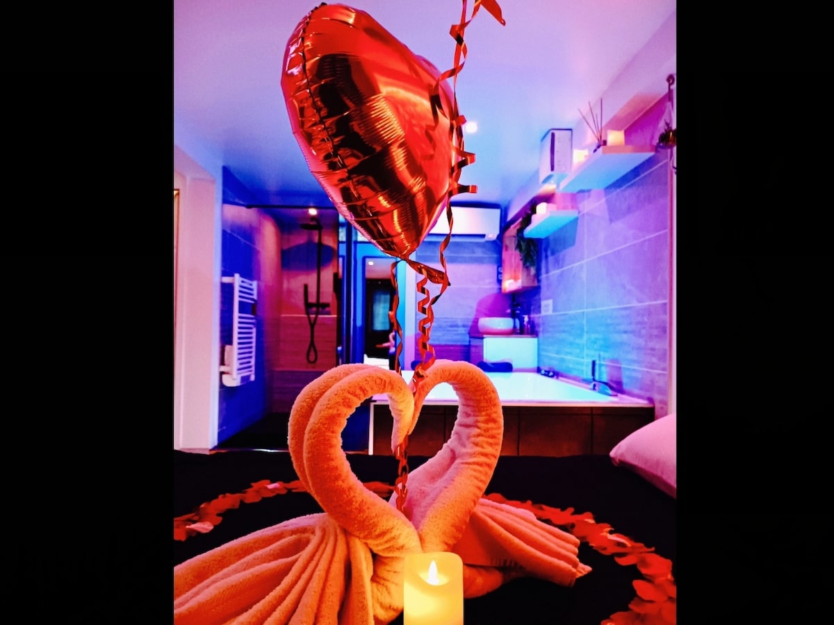 Venite a trascorrere un fine settimana romantico nel nostro cottage glamour e romantico pieno di fascino con pietra a vista , evadete con discrezione per una notte romantica e sensualità faranno sparire il tempo L'appartamento e dotato di una vasca idromassaggio privata e di una stanza maliziosa per rilassarsi e per rendere il vostro weekend ancora più benessere, godetevi un piccolo esterno zen che accompagna la suite.