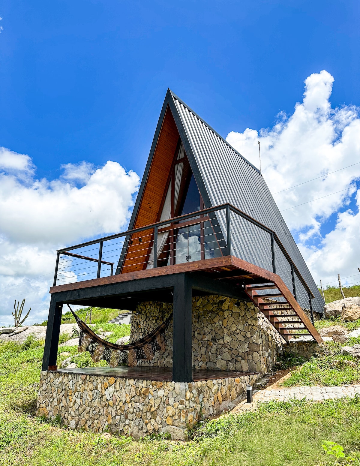 🍃 Primeira Cabana A Frame do Nordeste, a Cactos Haus é o seu lugar de descanso e contato com a natureza na Serra de São Bento (RN). O chalé Xique-Xique é climatizado e conta com chuveiro elétrico, Smart TV, frigobar, cama queen no mezanino e sofá-cama na parte inferior. Disponibilizamos também produtos de higiene pessoal (shampoo, condicionador e sabonete líquido), toalhas e jogo de cama completo.