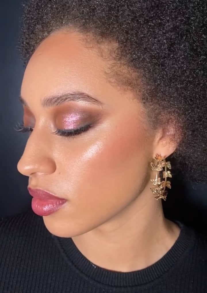 La carnagione rimane luminosa pur essendo più strutturata, gli occhi sono valorizzati grazie alle ciglia finte e anche il trucco delle labbra è più pronunciato.