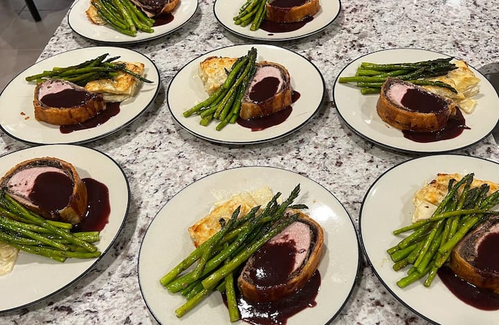 Lavorerò con te per creare un menu di tre portate che includa un antipasto, un antipasto con contorno di verdure e amido e un dessert. Metterò a disposizione personale per servire te e i tuoi ospiti al tavolo da pranzo. I prezzi possono variare in base al menu e al numero di persone richieste.