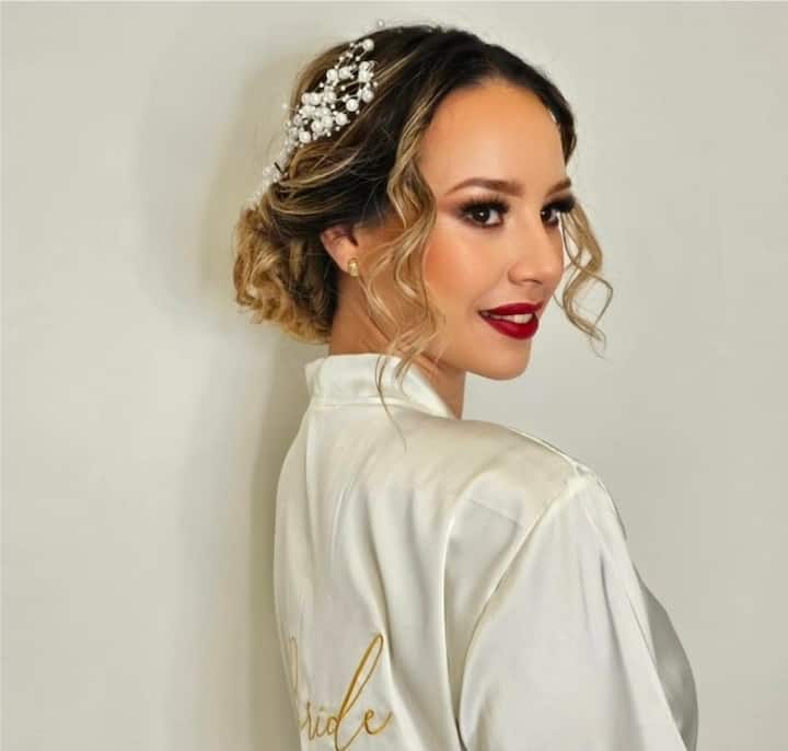 Questa opzione è stata creata per far risplendere le spose nel loro giorno speciale e include consulenza per l'immagine, una prova completa del look prima dell'evento, cura della pelle, ciglia finte, trucco e acconciatura a lunga durata, oltre a un kit di ritocco opzionale.