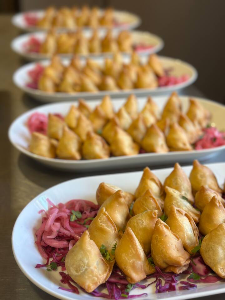 Selezione di stuzzichini vegetariani salati freddi (samosa di verdure, kebab di barbabietola e hummus, verrine di lenticchie all'indiana, sweet potato chaat)